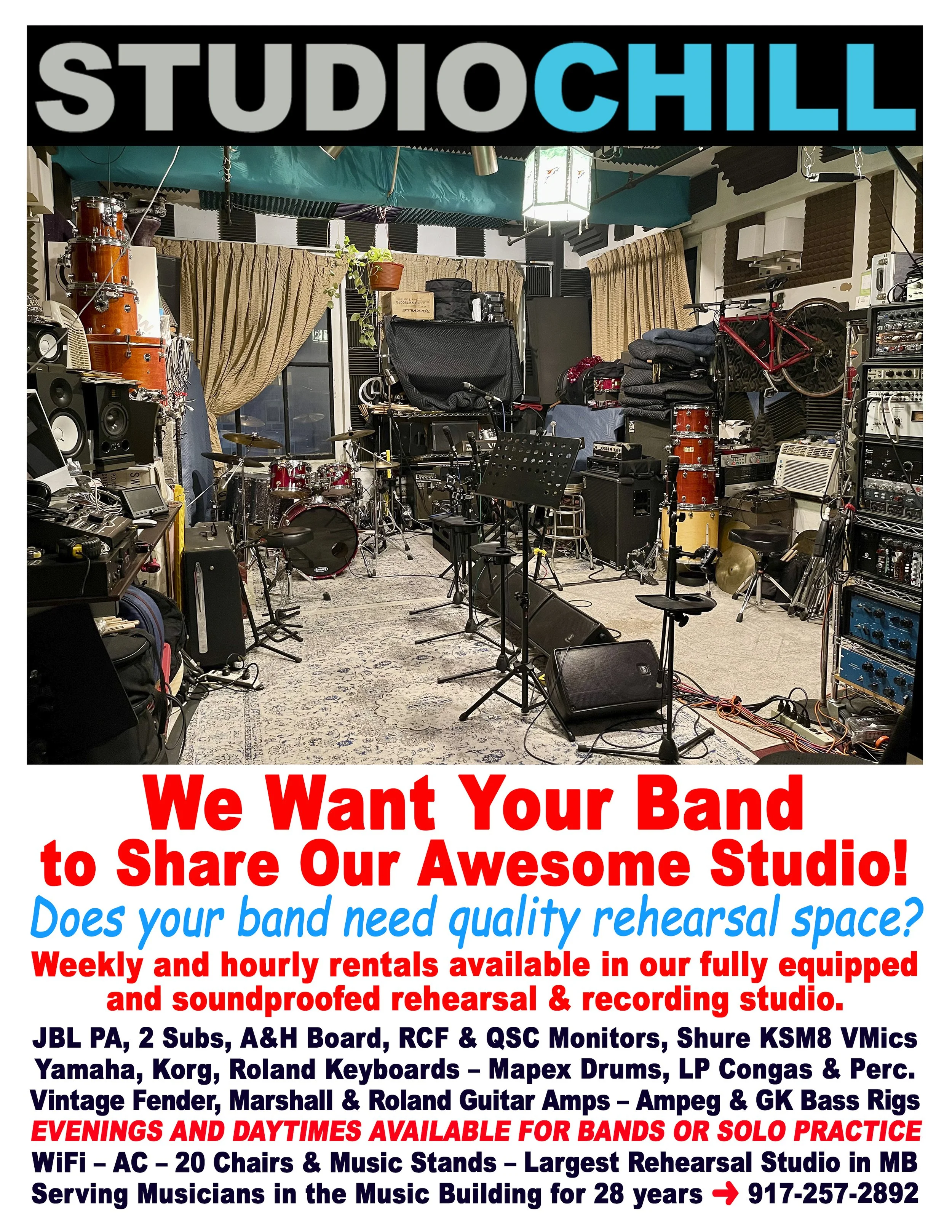 Studio Chill, an independent rehearsal and recording studio operating in Times Square, NYC for 28 years, offers hourly and monthly rentals for bands, producers, and solo practice, and vocal and ensemble recording.